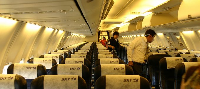 旅客機は夜間、離着陸するとき機内の照明を落とす。